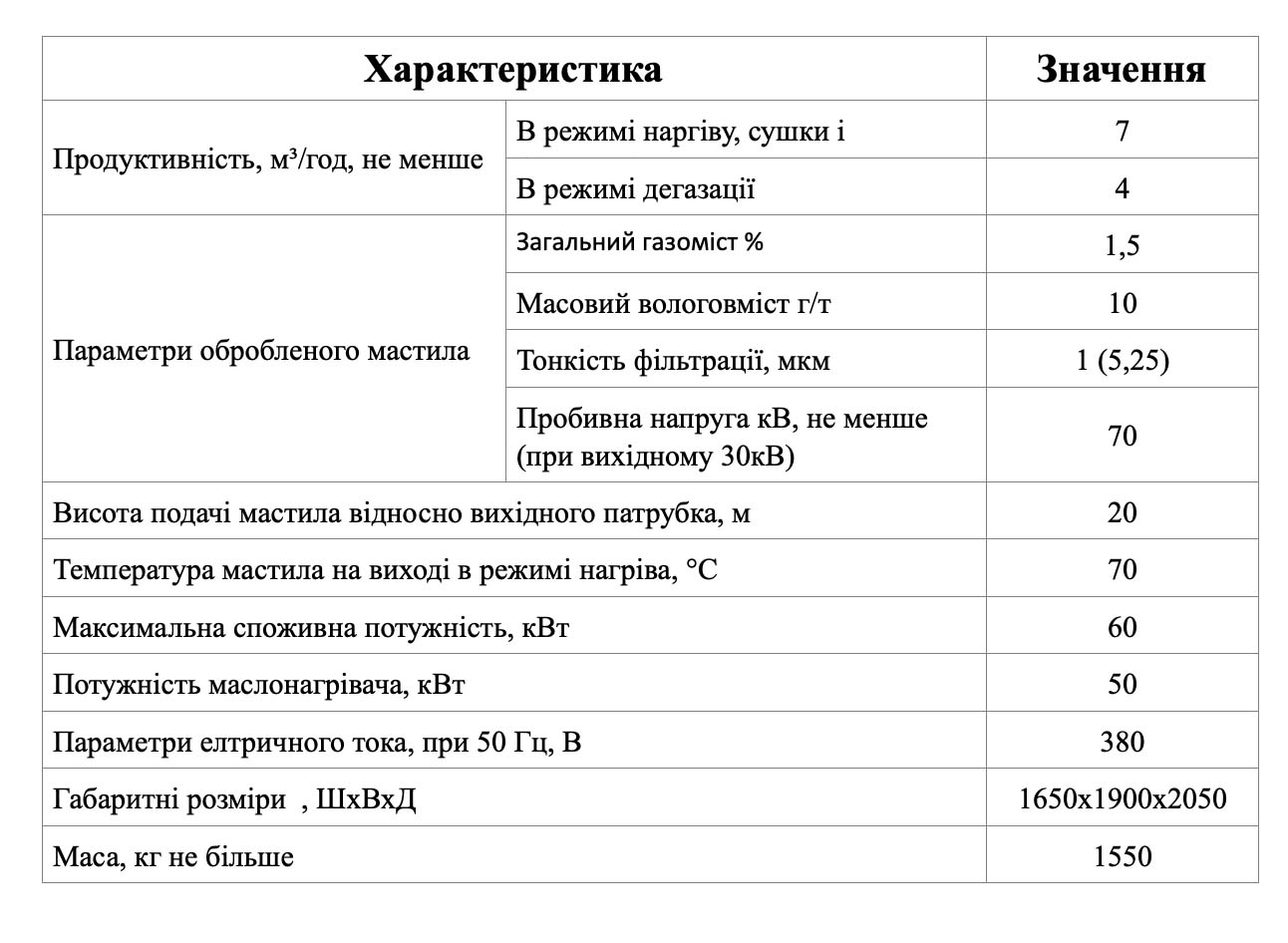 Параметри обробленої олії: – об’ємний газоміст мастила, не більше 1,5%; – масове вологовміст масла 10 г/т; – клас промислової чистоти за ISO 4406 – 9; – вміст механічних домішок 8 г/т; – тонкість фільтрації, 1 мкм; – пробивна напруга, щонайменше 70 кВ.